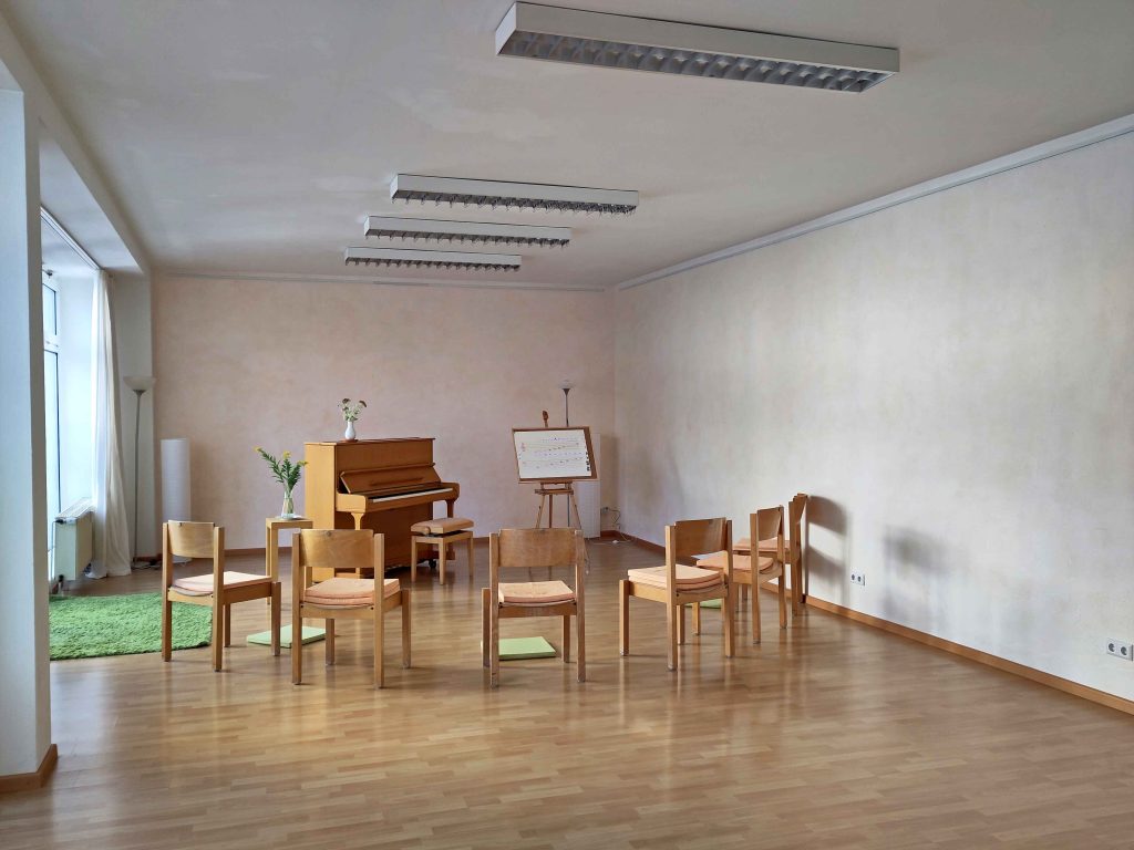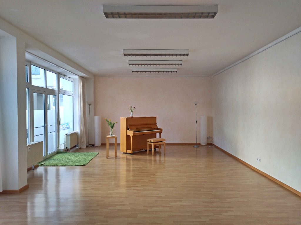 Alle Seminare in Karlsruhe – Singen nach der Schule der Stimmenthüllung, Vom-Blatt-Singen und Wasserphänomene – finden in einem großen, lichtdurchfluteten Raum statt. Für Einzelarbeit / Unterricht steht außerdem ein kleinerer Raum zur Verfügung. Die Bilder geben einen Eindruck des großen Raumes.